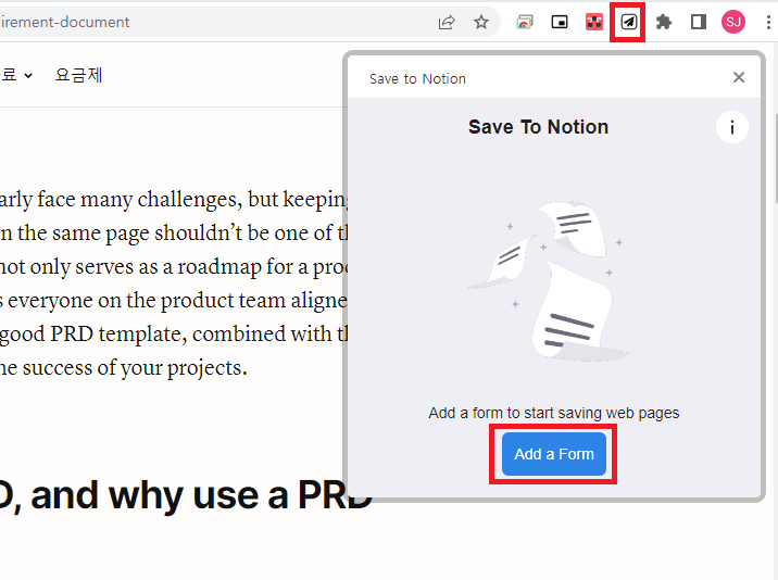 3-1. 스크랩하고 싶은 웹사이트에서 Save To Notion → Add a Form 클릭