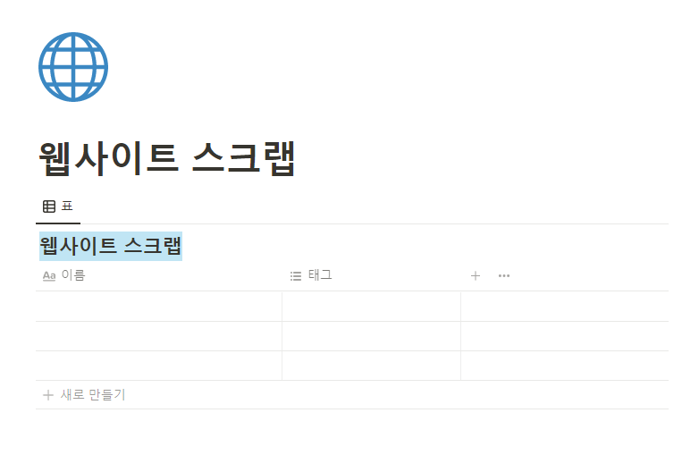 노션(Notion)에 웹사이트 스크랩을 할 페이지 및 데이터베이스(DB)를 추가합니다. 저는 이름은 단순하게 “웹사이트 스크랩”으로 짓고 웹(Web) 아이콘을 추가했습니다.