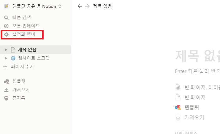 💡 노션(Notion)에 들어오면 왼쪽 상단에 설정과 멤버라는 메뉴가 있습니다. 해당 메뉴를 클릭하여 설정 창에 들어갑니다.