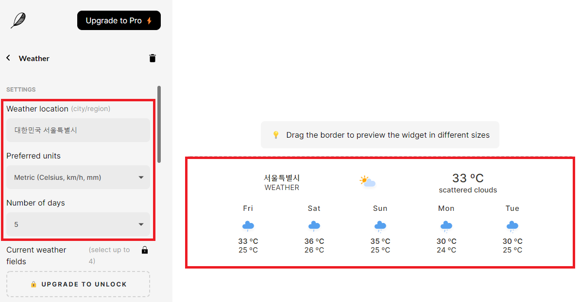 💡 오른쪽에 출력되는 결과물이 사용될 날씨 위젯입니다. 우리나라에 맞게 사용하려면 설정이 필요합니다.