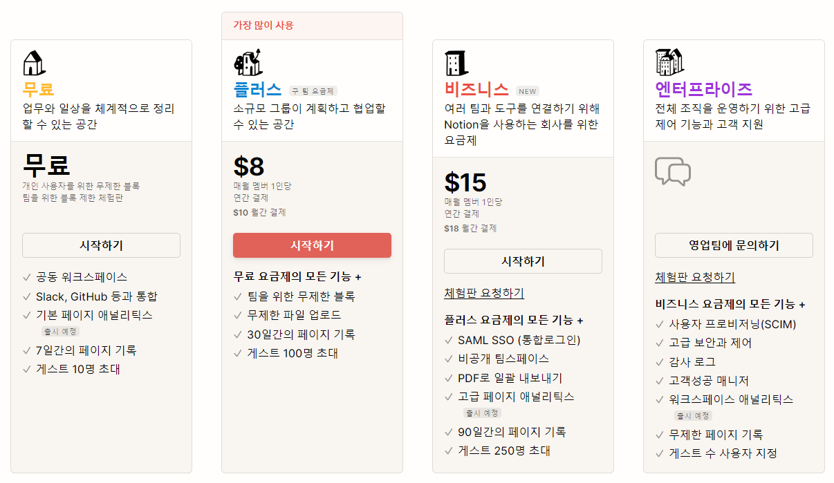 💡 노션(Notion)의 요금제는 무료, 플러스, 비지니스, 엔터프라이즈가 있습니다. 대부분의 기능을 불편함 없이 무료 요금제로도 충분히 사용 가능합니다.